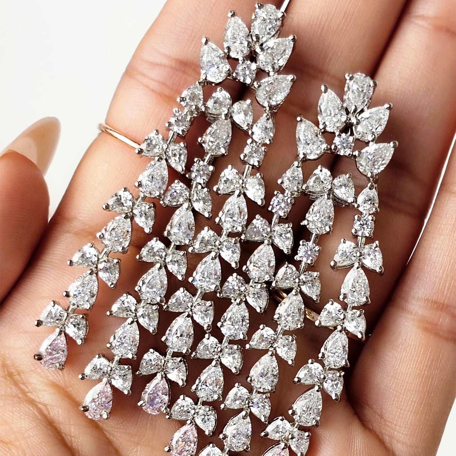 Crafted in 92.5 Sterling Silver, these statement earrings feature White and Pink Swarovski Zirconia stones sized 4mm–6mm. With an impressive length of 67mm and width of 25mm, they are designed to exude elegance and modern sophistication.